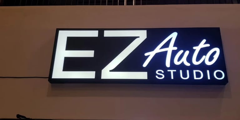 Kotak 3D dengan lampu di dalam, membuat desain/logo menyala terang.